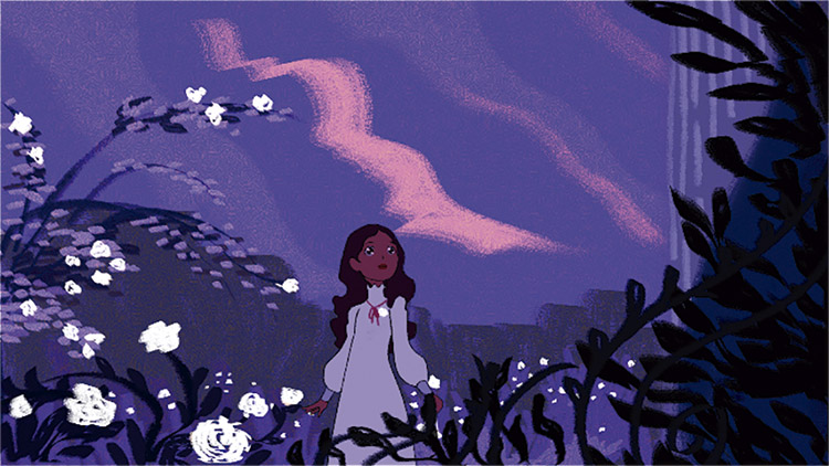 Parte 1: Nesta parte, são utilizados tons de azul, roxo, rosa, branco e vermelho. Segundo Heller (2012), as cores da fantasia são: azul, roxo e laranja. No entanto, nesta animação, o laranja foi substituído pelo rosa, pois, além de possui um caráter de delicadeza e juventude, é uma cor mais próxima do roxo na escala cromática. O uso do contraste entre cores análogas possui como objetivo criar um ambiente de tranquilidade.