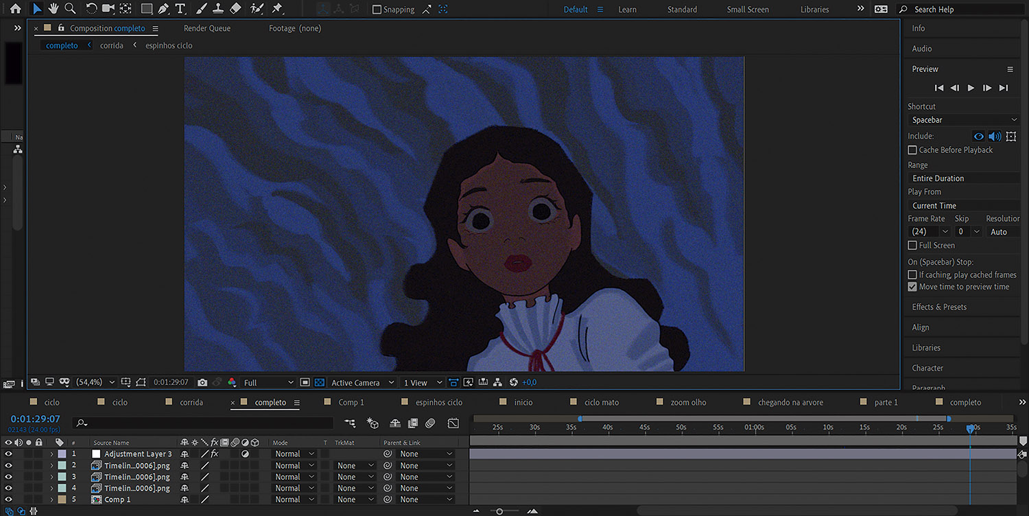 Durante esta etapa, foi utilizado o programa After Effects para realizar a montagem das cenas. O programa foi utilizado por garantir ao autor do projeto a liberdade de acertar o timing entre animação e trilha sonora.