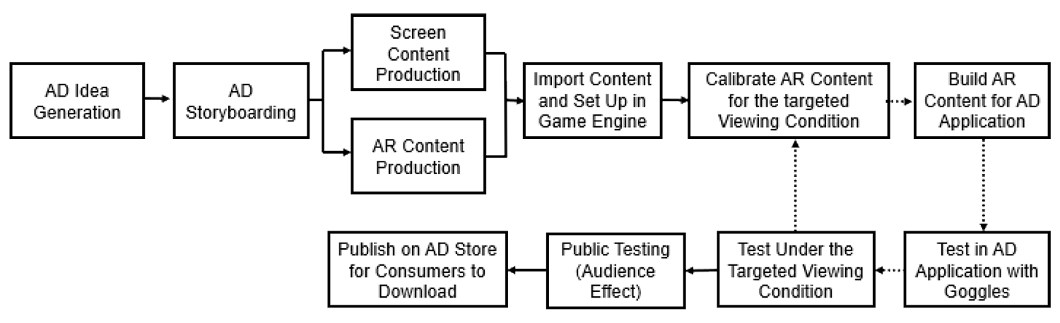 The development of AD integrates the processes of filmmaking, visual effects (VFX) in the game engine and the AR application development. The proposed pipeline is based on the workflow of game production including pre-production, production, calibration, and testing. Calibration is a specific phase added in the pipeline for the accurate alignments between AR content, screen, and targeted viewing environments. See Image 1.