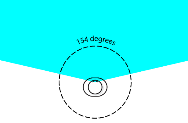 According to Lim & Lee, motion sickness in VR increases with a higher Field of View (FOV), such as the angle of what is observable from a particular vantage point, measured in degrees (Lim and Lee 2023). A restricted FOV offers a more comfortable experience and McCurley suggests 154 degrees when allowing head turn (McCurley 2016). For a viewing experience seated in a movie theater, we assume this angle would be appropriate for AD. See Image 2.