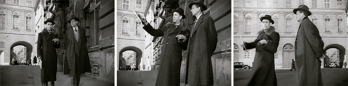 La secuencia de la llegada de ambos se filma con una serie de tomas fijas en campo/contracampo que muestran, alternativamente, a la pareja, mientras se aproxima a la puerta del edificio sobre la Josefsplatz, y a un grupo de personas frente a ésta [véanse fotogramas 18 a 23]. Estas últimas tomas adoptan el punto de vista de Anna y Holly, por lo que no le quedan dudas al espectador de que Anna y Holly se desplazan sobre una misma dirección, paralela a la fachada principal del edificio, la que contiene el acceso flanqueado por las cariátides. Ante la sospecha de que algo extraño ha ocurrido, Anna se detine y permanece de pie, mientras Holly avanza hacia el grupo para averiguar lo sucedido. Como no comprende el alemán, Anna acude a su auxilio y le comunica lo ocurrido: han asesinado al portero, quien iba a revelarles un secreto esencial para esclarecer la muerte de Lime [véanse fotogramas 24 a 30].