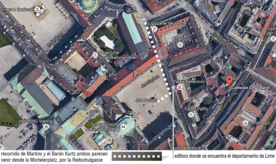 En ambas secuencias, la del arribo y la de la huida, los edificios que muestran las tomas sugieren que Anna y Holly llegan y huyen por la misma calle sobre la que se encuentra el acceso principal al edificio donde vivía Lime, calle que en un plano de la Viena actual se llama Reitschulgasse y que se continúa hacia el sur, después de atravesar la Josefsplatz, por la Agustinerstrasse.