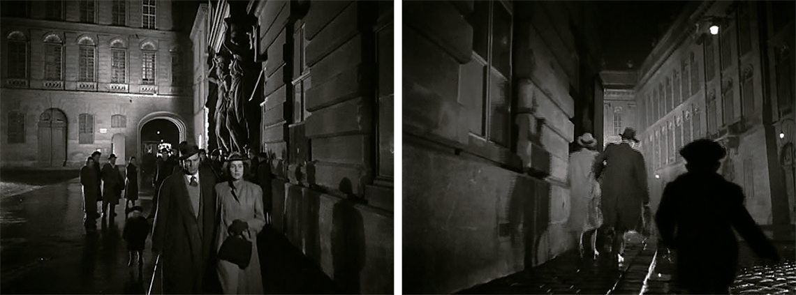 Escena 16 - plano / contraplano que capta la huida de Anna y Holly de la Josefsplatz. La secuencia sugiere que éstos huyen hacia la Augusterstrasse, es decir, hacia el sur [fotogramas 35 y 36]