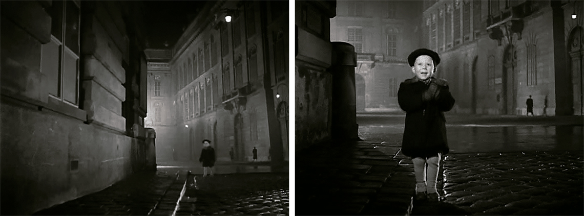 Efectivamente, la Viena que nos revela El Tercer Hombre es una ciudad sombría, tan oscura por la vida que palpita en sus entrañas como por su fotografía en blanco y negro que se regodea en los cuadros inclinados, en los fuertes contrastes o en los grises desoladores y tristes de lugares atribulados y vacíos. Abundan las tomas nocturnas en las que el espacio está apenas iluminado por focos ocultos tras las esquinas de los edificios o de muros semiderruidos que producen contraluces de potentes contrastes. Focos luminosos rasantes y bajos que crean sombras fantasmales de seres que se mueven en un espacio desolado, onírico, casi irreal.