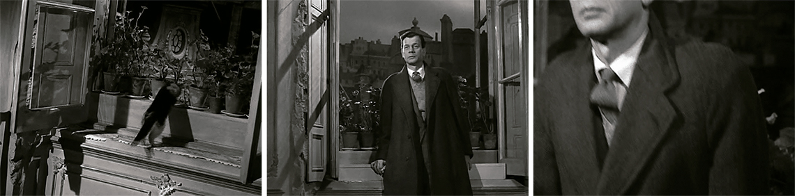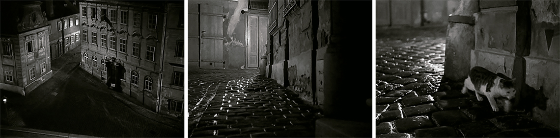 Escena 25 – La cámara se traslada al espacio frente al departamento de Anna Schmidt mientras sigue el recorrido del gato de Harry Lime que sale por la ventana a presentir la presencia de su querido amo [fotogramas 52 a 57]