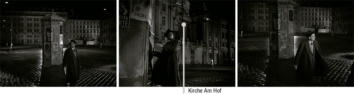 En una de las tomas del abrumado Martins que no logra encontrar a su amigo, aparece otro edificio emblemático de Viena que permite identificar el lugar. Es la Kirche Am Hof, cuya fachada se proyecta sobre la plaza Am Hof frente a donde supuestamente estaría el departamento de Anna según la versión de la Escena 10, versión que se contradice, como vimos, con la de la Escena 26.