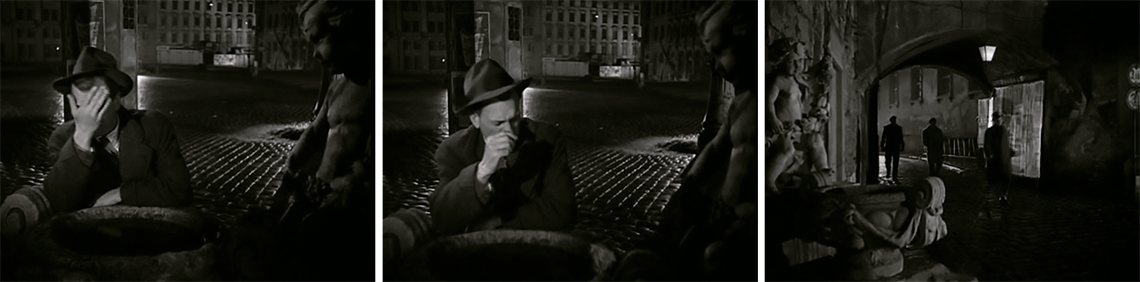 Después de que Holly Martins descubre a Harry Lime en el portal, intenta aproximarse, pero, repentinamente, un coche aparece y se lo impide [véanse fotogramas 58 a 71]. Una vez que hubo pasado el coche, Martins se aproxima al portal donde vio a su amigo, pero éste ha desaparecido.
