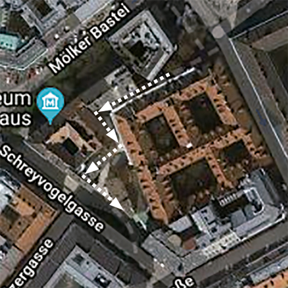 1 Así por ejemplo, si analizamos este recorrido, veremos que es imposible pasar directamente y en pocos segundos desde la Schreyvogelgasse a Am Hof, solo atravesando el arco del pasaje Schulhof, al costado de la Kirche am Hof.