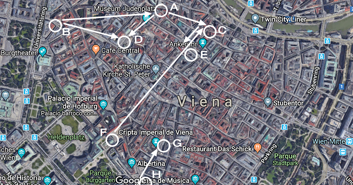 Figura 6 Mapa del centro de Viena con las locaciones de las diferentes escenas y los recorridos sugeridos en el filme, algunos de ellos imposibles de realizar, (tomado de Google Earth Maps)