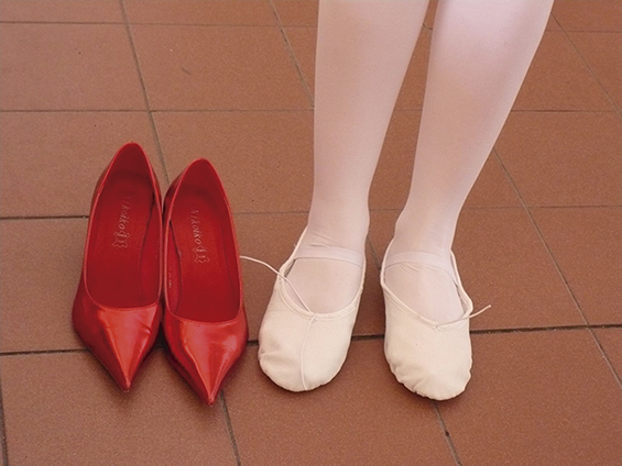Esses sapatos de dança vermelhos foram muito importantes porque estão vinculados ao tema que Pilar e Arantxa se propunham apresentar no congresso e que deu origem a um artigo: “Os sapatos vermelhos atrás de vitrines e telas digitais. Aplicação de um conto de fadas para reescrever a globalização” (Pérez e Marco 2010). Neste trabalho realizado na Universidade Autônoma de Madrid, com futuros alunos de Educação Primária, as artistas desenvolveram um processo criativo baseado no conto de fadas: Las zapatillas rojas. A forma como reaproveitaram esse arquétipo simbólico na indumentária teve ligação com a ideia de “vício”, pois no conto esses sapatos vermelhos que não param de dançar e levam a heroína da história a viver um processo de devastação e queda no submundo. Paralelamente a esta questão, o pormenor introduzido pelos sapatos vermelhos de dança relaciona-se com aquele possível comportamento viciante de “acumular méritos académicos”.