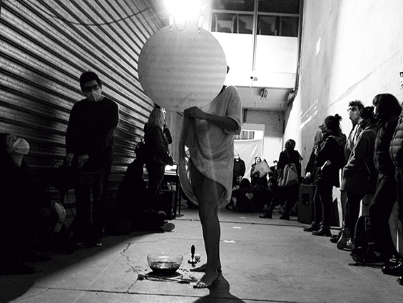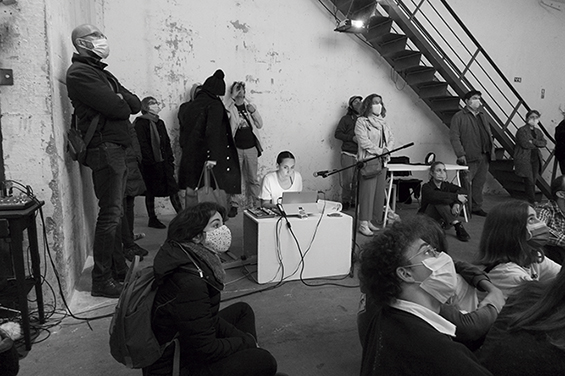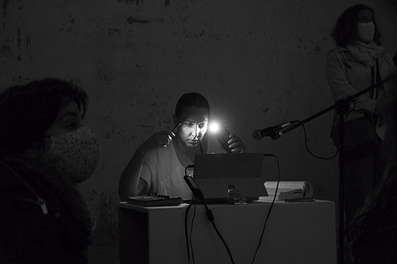 Figura 24 - Registo fotográfico da performance instalativa multimédia “Arquetipo(grafia) obscura do feminino”, (25/10/2020), Lisboa. (Fonte: Stratos Ntontsis).