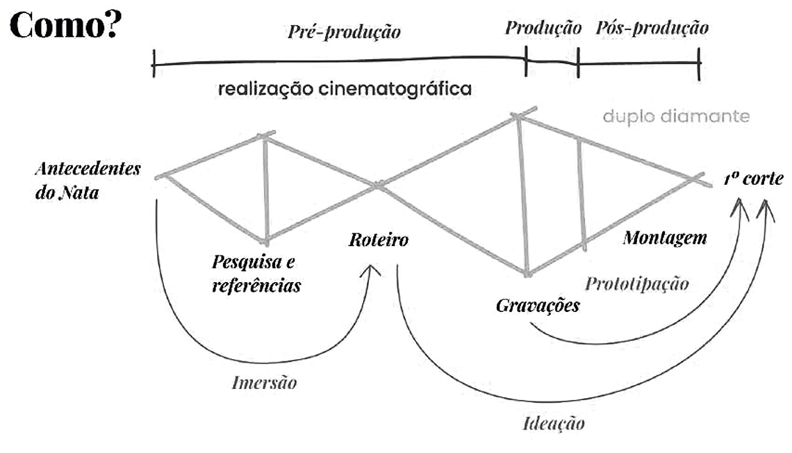 Diante disso, para lograr os objetivos do projeto foi construído um pequeno estúdio para a execução das cenas e gravação do curta-metragem em um cômodo de apartamento adaptado. A metodologia utilizada foi baseada em estratégias de design thinking e co-design (SCHNEIDER e STICKDORN, 2010; VIANNA et al., 2011; BRITTON, 2017), entrevistas com criadores e potenciais consumidores, roteirização, escaleta (COMPARATO, 2009), desenvolvimento de mapas e painéis conceituais, análises de referências e similares, figurinos e cenários, fotomontagens e prototipação do produto audiovisual (short film).