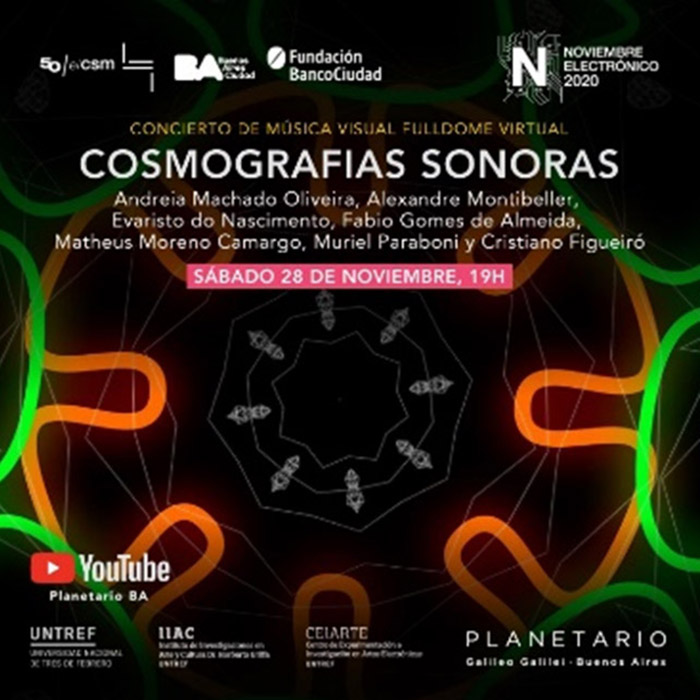 9Concierto de Música Visual en Fulldome – UVM (2016). Organizado pelo Cientro de Experimentación e Investigación en Artes Electrónicas da Universidad Nacional de Tres de Febrero e Cultural San Martín. Integrando a programação do Noviembre Electrónico 2016 e a BIENALSUR, no Planetário Galileu Galilei, da cidade de Buenos Aires. Programação e divulgação da mostra, disponível no link: http://www.ceiarteuntref.edu.ar/concierto-taller-fulldome2016