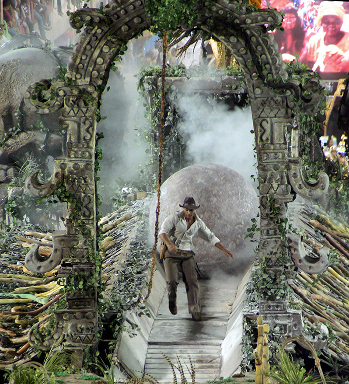 A partir dos anos 1980, portanto, as escolas de samba, cada vez mais, lançaram mão de referências textuais e imagéticas ao cinema, retiradas principalmente das produções hollywoodianas, que impregnaram o imaginário da humanidade desde o século XX. Escolha que se justifica pela legibilidade imediata que a imagem cinematográfica permite aos espectadores dos desfiles. Os estúdios de Hollywood sempre buscaram um mercado mundial ao apresentar filmes que dispensavam códigos de compreensão particulares, para apresentar-se não apenas como arte de massa – elaborada coletivamente e cujo próprio modo de produção permite uma recepção também coletiva –, mas também como arte de consumo de massa destinada a promover um consumo renovado cuja principal ambição é entreter, proporcionar um prazer acessível a todos, para deleite do maior número possível de pessoas (Lipovetsky e Serroy 2009, 65).