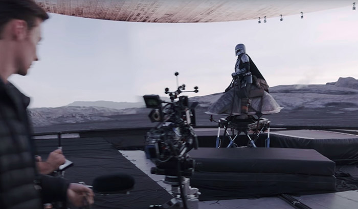 The benefits of displaying images on LED walls as backgrounds for actors combined with camera tracking are valuable. Actors feel more integrated with the virtual world, resulting in more immersed performances. All the illumination and natural glare emitted by the screen directly influence the actors’ lighting, avoids colour mixing and glare from a traditional green screen and enhances the realism of the images. One use case that perfectly represents LED wall utility is the production of the series ‘The Mandalorian’ where the main character wears a reflective armour that would pose tremendous difficulties for compositors if used in green-screen sets (The Mandalorian 2019). Image 5 shows how images emitted by the walls are reflected on the armour and the actor becomes fully integrated in the scene.