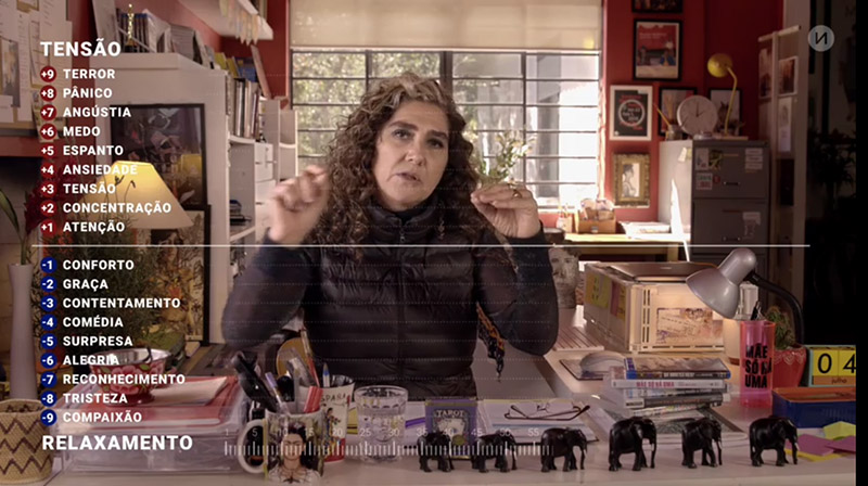 Figuras 3 – A cineasta Anna Muylaert descreve o uso do gráfico das emoções que costuma utilizar em seus filmes e como considera importante o permanente cruzamento da linha do meio entre as emoções para manter a dinâmica dos filmes.