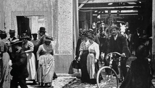 As primeiras experiências de registo de imagens em movimento realizadas, ainda no final do século XIX, pelos franceses Auguste e Louis Lumière, demonstravam já um especial enfoque em temáticas do dia-a-dia das pessoas (McLane 2012, 9-10). Considerados como uns dos primeiros realizadores da história do cinema, os irmãos Lumière produziram centenas de filmes de um só plano e com uma duração que raramente ultrapassava um minuto. Estes filmes apresentavam eventos tais como a saída de operários de uma fábrica (Fig. 1), a chegada de um comboio ou de um barco, o jantar de um bebé ou as peripécias de um jardineiro. Muitos destes filmes eram resultantes de processos de encenação, nos quais, por restrições próprias da natureza rudimentar do sistema de captação de imagem em movimento, as pessoas agiam segundo ordens específicas do operador de câmara. Ainda assim, será possível reconhecer nesses filmes diversos detalhes ilustrativos da época, nomeadamente vestuário e hábitos das pessoas. No entanto, o termo documentário ainda não tinha sido cunhado1.