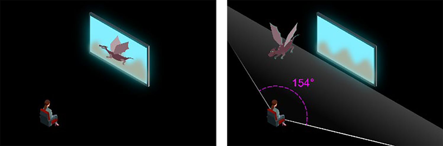 According to Lim & Lee, motion sickness in VR increases with a higher Field of View (FOV), such as the angle of what is observable from a particular vantage point, measured in degrees (Lim and Lee 2023). A restricted FOV offers a more comfortable experience and McCurley suggests 154 degrees when allowing head turn (McCurley 2016). For a viewing experience seated in a movie theater, we assume this angle would be appropriate for AD. See Image 2.