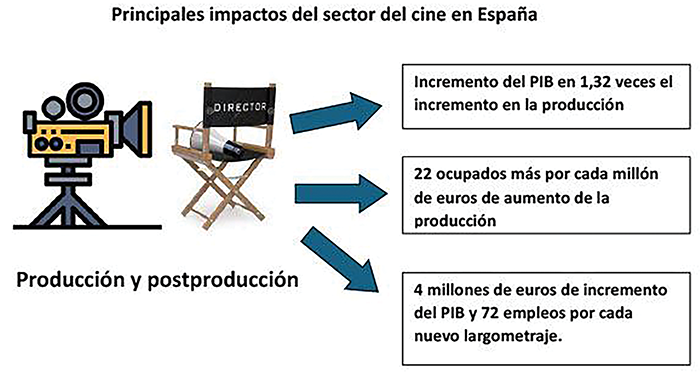 La realización de una película en España tiene un importante efecto sobre la economía en su conjunto, no sólo mediante la inversión directa concretada en la misma, sino a través de los efectos que causa el uso de inputs y los posteriores impactos que las rentas de los factores van diseminando en bucle en el conjunto de las actividades económicas. Así, las actividades de producción y postproducción cinematográfica tienen un efecto multiplicador del output de 2,6 y 2,5, respectivamente, lo que supone que cada millón de euros producido por estas actividades permite la creación de 22 y 37 empleos en el conjunto de la economía española. El efecto en el valor añadido (VAB ) también es muy significativo (1,32 y 1,42 euros, respectivamente, de efecto multiplicador).