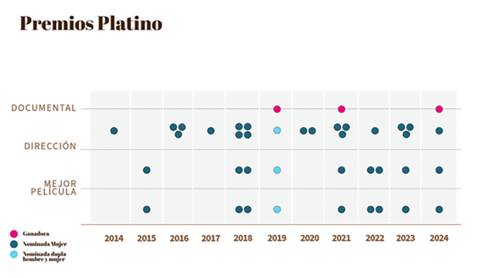 También se puede ver cómo en el 2014, 2015 y 2016 la presencia de mujeres es baja. Mientras que en los Premios Condor ya en 2014 premiaban a mujeres en tres categorías, en los premios Platino había una sola nominada.
