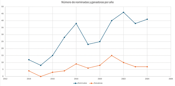 Gráfica 8 – Número nominadas y ganadoras por año. Elaboración propia.