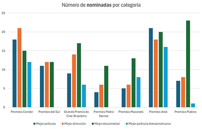 Otro fenómeno digno de apuntalar es que en los Premios Platino, los Premios Macondo, los Premios Pedro Sienna y el Grande Premio do Cinema Brasileiro la categoría documental tiene considerablemente más nominaciones que el resto. En los Premios del Sur están bastante parejas las categorías, en los Premios Ariel hay más nominadas al mejor película seguidas por la categoría documental y en los Premios Condor la categoría a mejor dirección es la que tiene más nominadas.