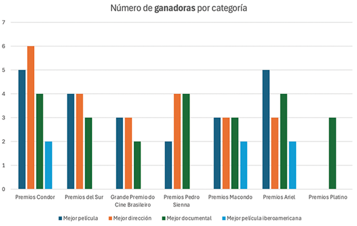 Aún y cuando hay muchas más nominadas en algunos premios, el número de ganadoras es más consistente. El número más alto lo tienen los premios Condor con 17 en total. Muy atrás en número de preseas se quedan los premios Platino con solamente 3 otorgadas.