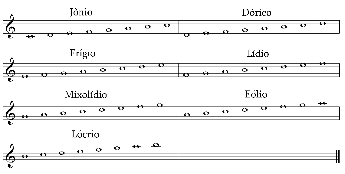 Entre os gregos, por exemplo, cada modo, evidenciando o seu caráter de verdadeiro território sonoro, era associado, pela sua denominação, a uma região ou povo. O modo dórico (formado pelos intervalos que vão de mi a mi), relacionado ao caráter viril dos lacedemonianos, era ligado tradicionalmente à solenidade (sonora e ética); o frígio (de ré a ré), de afinidades orientais, era ligado por sua vez ao dionisismo.4 (Wisnik, 2017, 87)