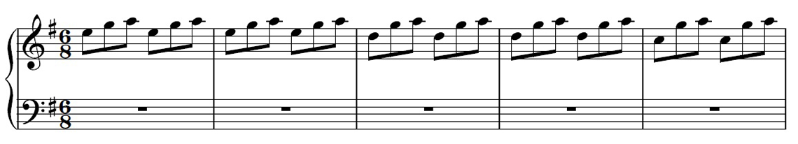A música inicia com intervalos curtos para remeter à infância e aos “pequenos-grandes” passos que damos nessa fase. Por exemplo: Mi-sol (3°menor) e sol-lá (2° menor). Os intervalos são definidos por Med (1996, 60) como diferença de altura entre dois sons. Os intervalos se repetem e aos poucos ganham uma diferença maior: Ré-sol (4° justa) e Dó-sol (5° justa).