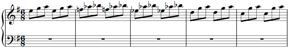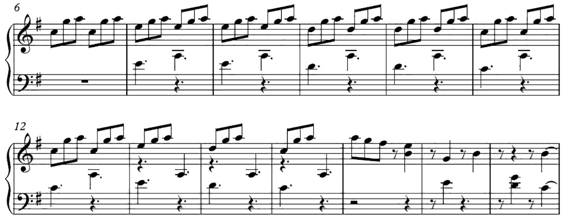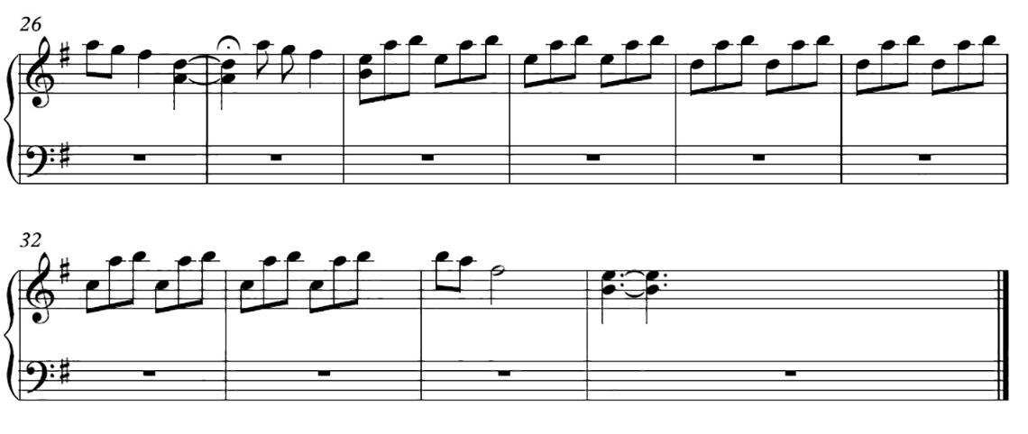 A música ganha acompanhamento da clave de fá a partir do compasso sete, ressaltando e contrapondo com as mesmas notas da clave de sol apenas uma oitava abaixo do tema que vem sendo tocado. Posteriormente, entre os compassos treze e quinze, por meio da liquidação do motivo musical7 destaca-se no segundo tempo de cada compasso o isolamento de uma única nota que antecede o espectador para a próxima fase da música.