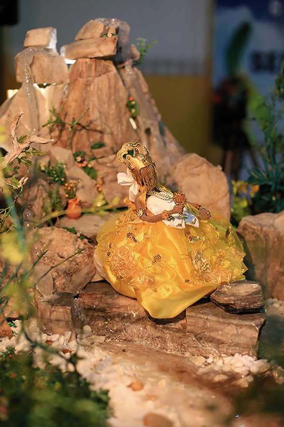 Òsùn é uma Òrìṣà feminina, divindade das águas doces, dos rios e cachoeiras, é ela a Deusa das riquezas, do amor, da prosperidade e da beleza, cultuada na Nigéria, Brasil e em Cuba, suas filhas e filhos “usam colares de contas de vidro de cor amarelo-ouro e numerosos braceletes de latão. O dia da semana consagrado a ela é o sábado e é saudada, como na África, pela expressão ´Ore Yèyé o!!!!´ (Chamemos a benevolência da Mãe)” (VERGER, 1981, p.176). “Senhora do Ouro”, simboliza beleza, graciosidade e elegância, é ela, quem soluciona os problemas do amor e da riqueza. A criação da boneca da personagem Òsùn seguiu como referência os paramentos e vestes utilizadas pela Òsùn do Abassá da Deusa Òsùn de Idjemim. Este procedimento se mostra necessário na criação artística com elementos sagrados do Candomblé, dada a grande diversidade de elementos, características e qualidades de cada divindade, em cada casa de candomblé. Além disso, é importante notar que, no Candomblé, cada elemento é significante, cada cor, cada forma e cada composição fala, se comunica. Misturar referências significa, interromper esse fluxo de comunicação que é sagrado.