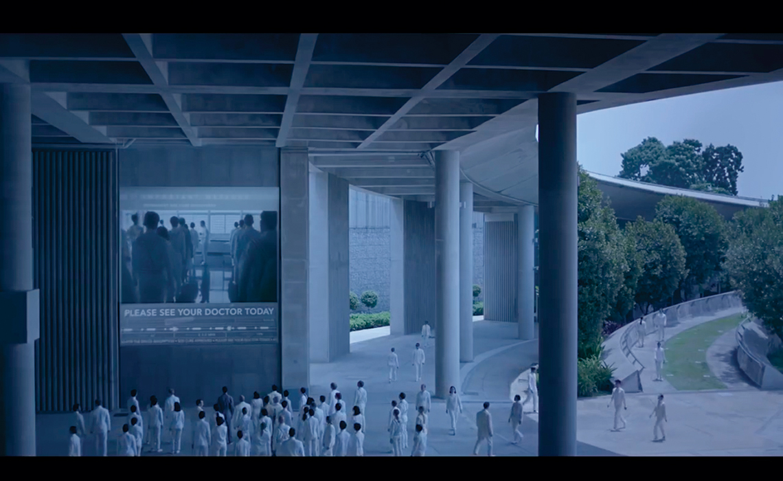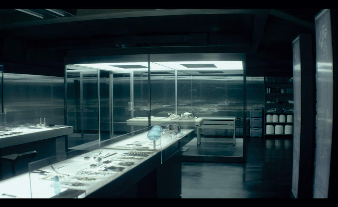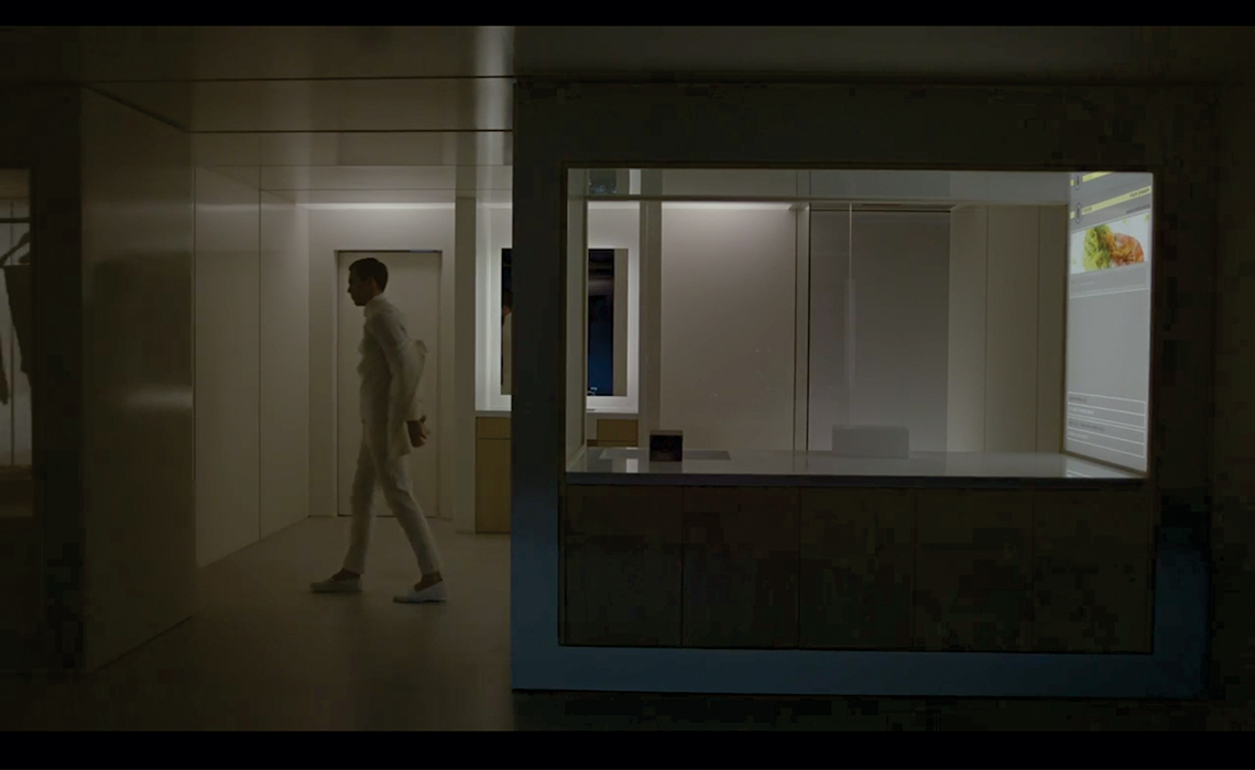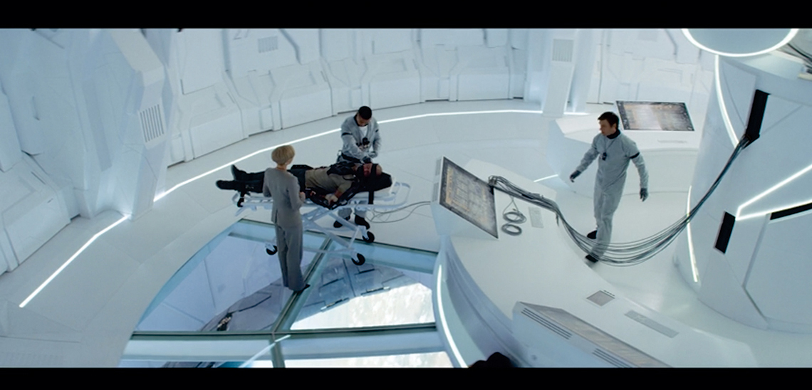 Esse é o caso de filmes mais contemporâneos como Iguais 12 (Drake Doremus 2015) e Ex_machina 13(Alex Garland 2014) (Figuras 1 e 2). No primeiro, a história se passa em um local com um visual similar ao de hospitais. Os ambientes são, em sua maioria, brancos, vazios e iluminados por uma luz fria, com toques pontuais de luzes coloridas. A aparência do concreto é recorrente em muitos ambientes, assim como a do vidro. Grande parte dos personagens, independentemente do gênero, veste um uniforme branco.