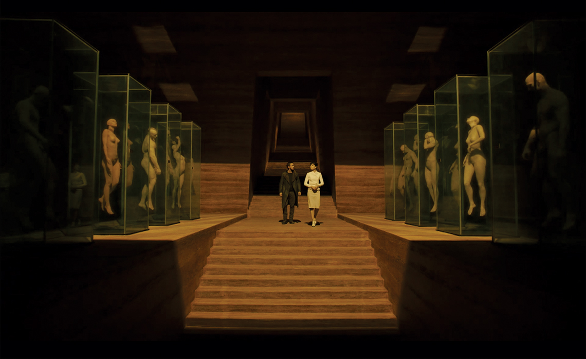 Alguns ambientes de Blade Runner 2049 remetem ao primeiro filme Blade Runner (Ridley Scott 1982). A cidade é retratada por meio de um cenário escuro e repleto de fumaça, prédios, sinais luminosos e hologramas. Por outro lado, há também ambientes nada poluídos, constituídos por muitas linhas retas e ângulos precisos.