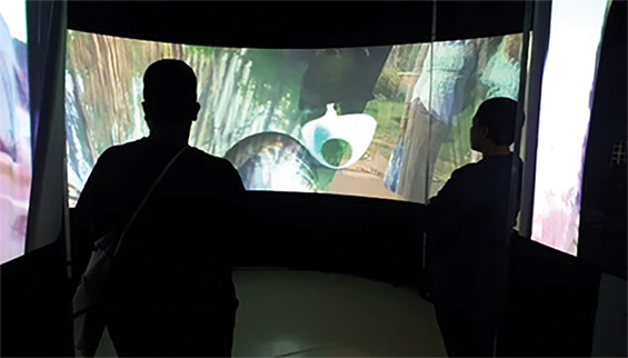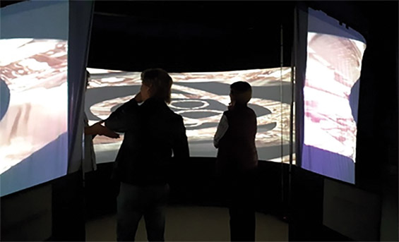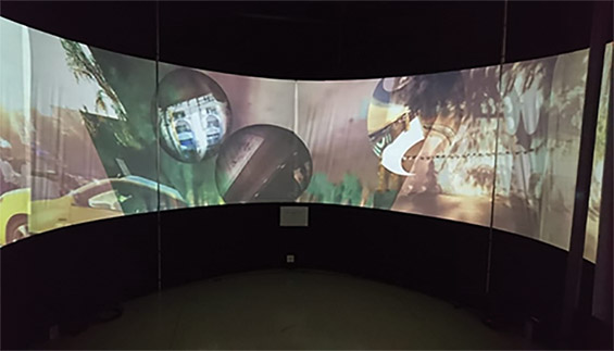 Inicialmente “Monumentos Virtuais” foi produzido para formato fulldome, contudo quando este projeto foi repensado e adaptado para uma tela panorâmica, composta de modo horizontal em 360º, percebemos que o público teve uma maior liberdade de visualização, pois podia se deslocar imerso no espaço expositivo, o que não acontece em planetários com projeções em suas cúpulas, pois todos se encontram sentados em cadeiras olhando para cima.