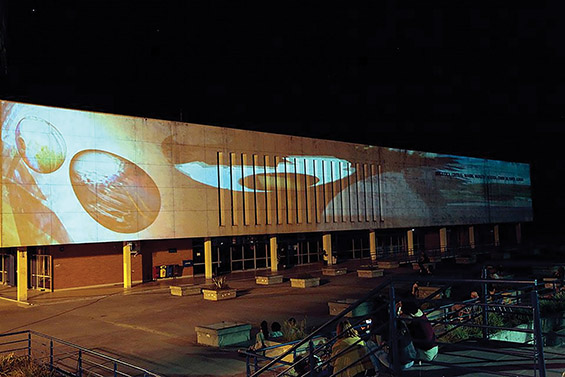 Com isto, o elemento arquitetônico tem sua materialidade testada ao ter sua superfície sobreposta por imagens, e tem sua mutação ativada pela presença do público, imerso ou interagindo com as imagens, potencializando as relações simbióticas e sinestésicas, que ampliam os modos de comunicação do corpo com as tecnologias. Acessando fluxos interativos recíprocos, que fazem surgir uma espacialidade informativa, sem dentro ou fora, mas habitável em imagens.