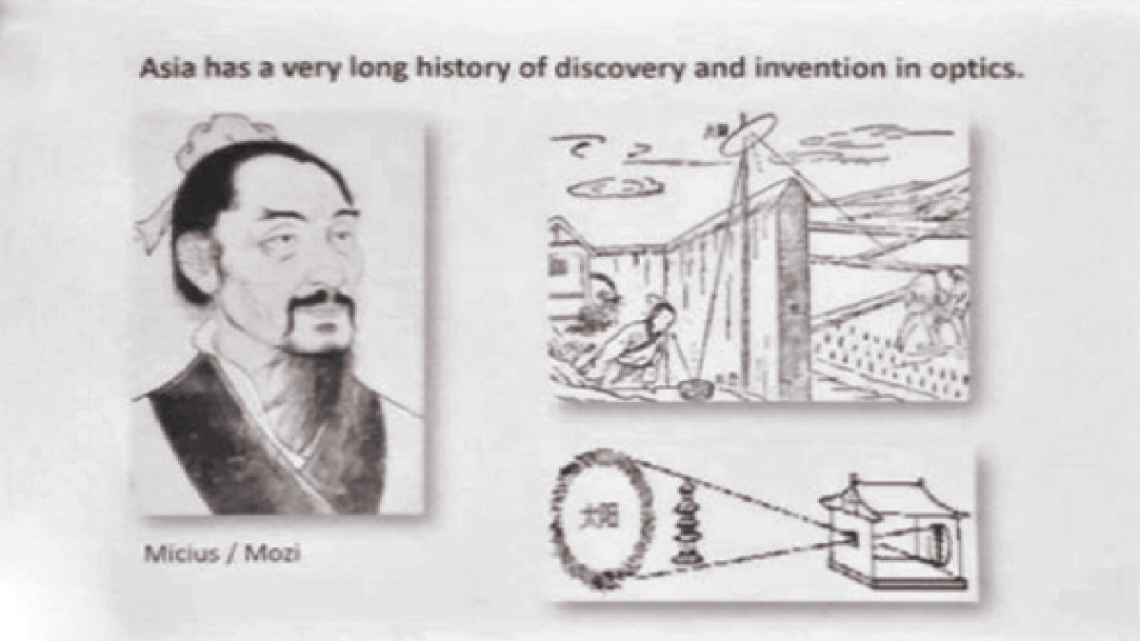 At films, events unfold along a timeline, applying motion to still photograms, usually covering 24 to 30 frames in a single second, enough for the human eye perceive a kinetic continuum of shapes. Light plays a decisive role in the ways we see the world, being a vehicle for the propagation of ideas that eyes catch. The study of optics and image projection originated in China with Mo Di (470-390 BC), as well known as Mozi 墨子. An artisan and polymath that excelled in making unusual devices (Figure 7), being able to form an inverted and focused image when light passed through a pinhole. He was the first to accurate theorize about light, a century before the Euclid optics understandings (Purtle 2018).