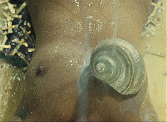 Parajanov uses several props to symbolize the female sexuality throughout the film. The bath scene represents the boy’s erotic awakening. He sees a woman’s chest and imagines it covered by a shell. It is after the bath scene that Sayat-Nova gains another persona, the Muse (Parajanov gives an implication of bisexuality), and it is not a coincidence that young Sayat-Nova and the Muse are played by the same actress.