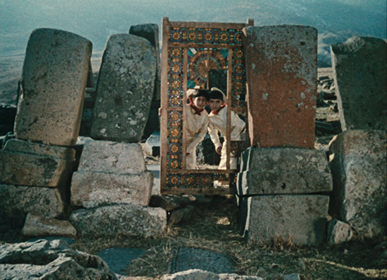 The Colour of Pomegranates (1969) is in no sense a literal biography, nor a historical film. It is rather a poetic film, created with the help of the nature and cultural elements of architecture, handicrafts, rituals, and poetry of the time. Sayat-Nova lived during the beginning of the 18th century, in times of cruelty, invasions, and yet his poetry and his songs stood still against the violence as he described and celebrated humanity, beauty and life. The same way, the film depicts the ashugh’s pictorial world: we witness mystifying rituals and strange beliefs and experience the harmonious relationship between people and nature, feelings and thoughts, colours and forms, silence and sounds. Parajanov’s interest in everyday customs, games and songs is not merely ethnographic: through folklore he wishes to communicate the moral and aesthetic atmosphere of people’s lives. The film produces a sense of the new out of a rearrangement of old and explores the inner world of Sayat-Nova through symbols drawn from the medieval Armenian culture and Apostolic Christianity. In his interview to the Soviet Screen (Советский экран) 1969, p. 184)) he mentions: “We are recounting the epoch, the people, their passions and thoughts through the conventional, but unusually precise language of things. Handicrafts, clothing, rugs, ornaments, fabrics, the furniture in their living quarters – these are the elements. From these the material look of the epoch arises.”