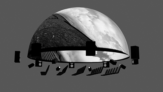 Figura 2 - Representação esquemática de um planetário fixo, com tela hemisférica, poltronas unidirecionais, projetores digitais, e som espacializado. Fonte: elaborado por Vitor Amaro Lacerda.