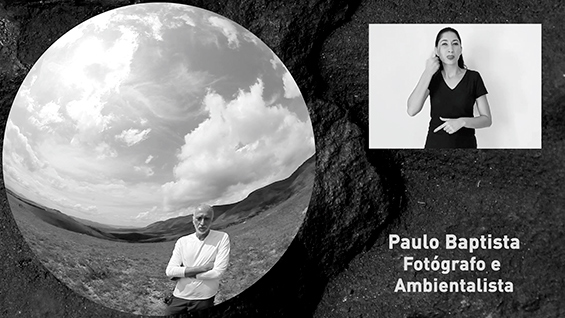 Figura 3 - Composição da tela na versão plana, contendo: textura de minério de ferro ao fundo; imagem circular própria da projeção fulldome; janela com intérprete em Libras; legenda de identificação do entrevistado. Fonte: captura de tela da versão plana do filme Inconfidências.