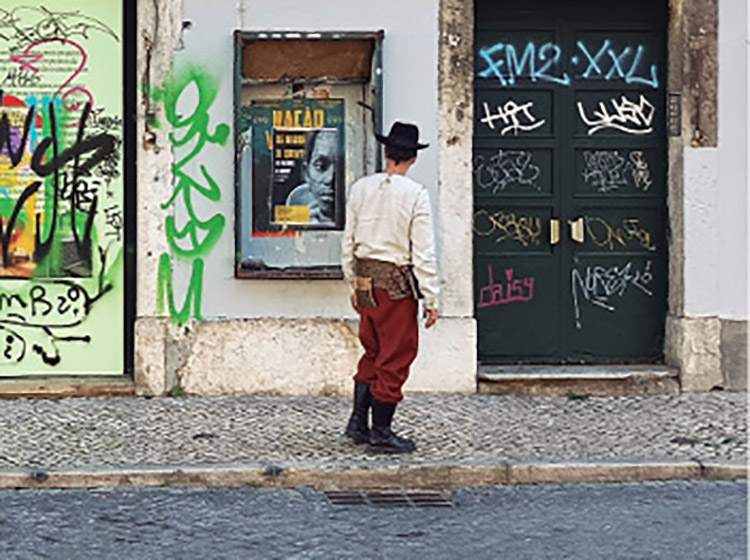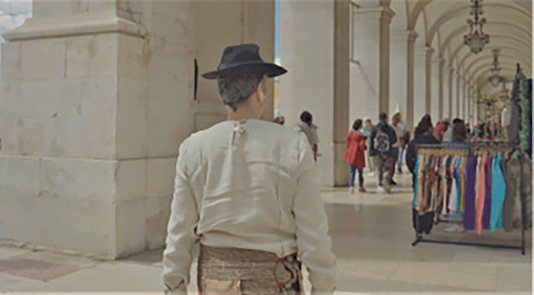 Os aspectos evocativos da memória colectiva e as suas interlocuções com o espaço urbano que estão presentes nesta caminhada já foram discutidos noutro lado (Antunes 2023). Esta comunicação foca-se agora no olhar deste cicerone. Propomos aqui discutir paralelos entre a caminhada e a cinematografia através da ação que o guia exerce conduzindo o grupo usando o seu olhar e pequenos gestos. Para isso, iremos partir de um filme que fizemos documentando a caminhada Imemorial e que se foca nessa perspectiva subjectiva do cicerone e do seu movimento corporal, calcorreando as ruas no seu percurso. Acompanhamo-lo. O cicerone surge num figurino que induz alguma sensação de estranheza. Algo anacrónico, mas que não conseguimos situar no tempo. Remete-nos talvez para a ficção científica, mas é-nos permitido lê-lo como um ser fora de tempo, um visitante a-temporal. Move-se de forma lenta, observante. Nitidamente um visitante. Como um flâneur vindo de um outro mundo, de um outro tempo (Fig. 1).