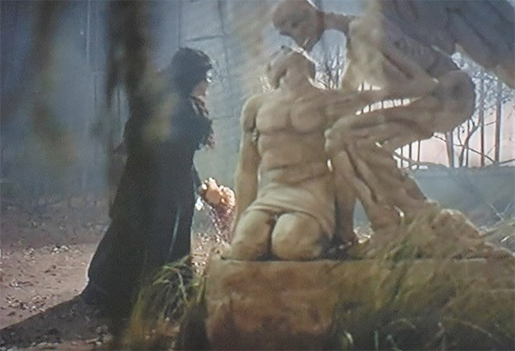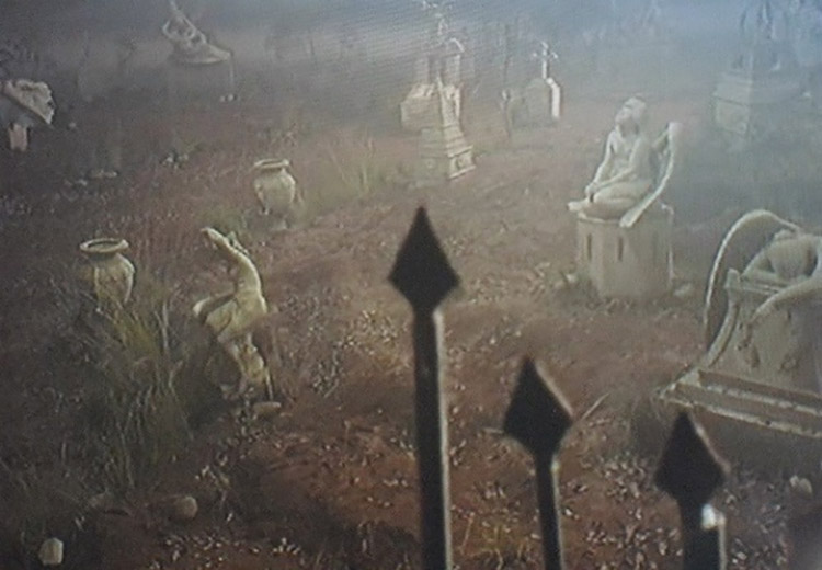 Figura 4: Arlinda caminha no cemitério entre as estátuas dos túmulos.