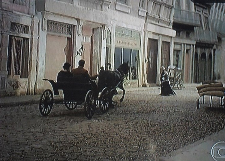 Identificamos alguns pontos de contato entre a cidade da obra fantástica de Maupassant com Amorteamo. Percebemos traços góticos nas esculturas do cemitério, conforme nos mostra a figura 4, com as cabeças inclinadas para frente ou para trás, a rigidez nas posições e o panejamento dos tecidos. Contudo, a cidade retratada em Amorteamo foi fortemente inspirada na estética expressionista e não na arte gótica, pois segundo Gozzoli (1978), as cidades que apresentam essa estética exibem fortes muralhas com o objetivo de defesa, possuem o traçado urbano variado e irregular e exibem ruas estreitas e tortuosas que obedecem aos acidentes naturais do terreno. Observamos na figura 5 o traço expressionista no segundo andar de alguns sobrados, totalmente oblíquos.