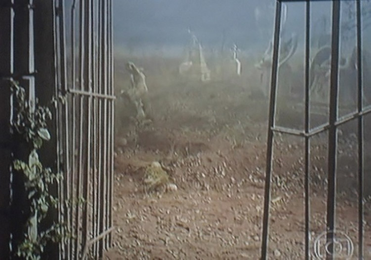 O cenário do cemitério também foi um local onde o sobrenatural se fez presente, pois a volta de Malvina morta se deu nesse espaço. O fictício cemitério em Amorteamo está repleto de códigos culturais: desde a entrada percebemos o simbolismo presente nos portões que convidam o indivíduo para uma terra onde a dor e a saudade são companheiras, ver figuras 11 e 12.