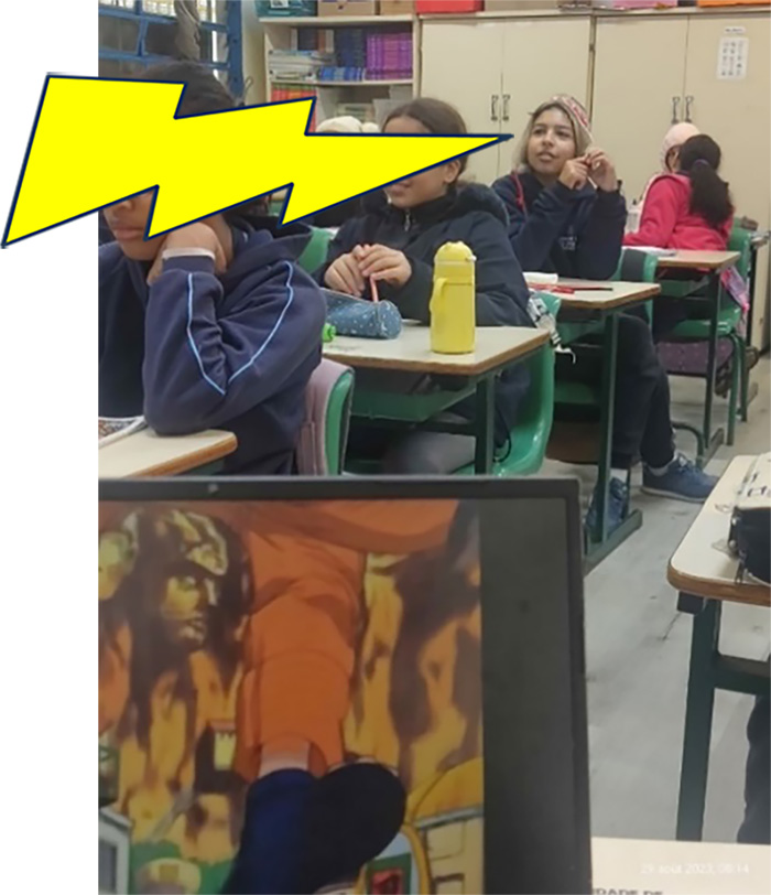 Começando o trabalho prático em sala de aula, durante a exibição dos vídeos, os alunos da turma 5B, a princípio, demonstraram pouco interesse, mas ficaram entusiasmados com a ideia de assistir Naruto. Alguns comentaram sobre as expressões exageradas na animação.