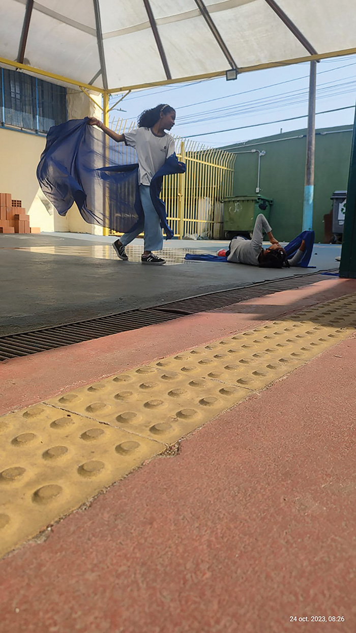 Dando sequência, o pesquisador, sem tempo para fazer o controle de presença (chamada) e avaliar em forma de notas as produções das crianças, deixou os estudantes partirem para mais uma criação performática na escola, e dessa vez, com base nos parangolés de Hélio Oiticica. Anteriormente, dava-se um espaço para um banho de leitura sobre as imagens e os sons das projeções, agora, propõe-se a ação do corpo pelo espaço escolar.