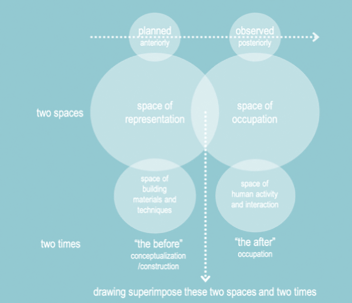 Es entonces pertinente que la arquitectura comparta con la etnografía ese espacio-tiempo y es justamente el dibujo el que superpone estos dos espacios y estos dos tiempos, primeramente, como herramienta de representación espacial en la planeación y después como ‘prácticas inscriptivas’ sobre la vida cotidiana en esos ambientes construidos. (ver figura 1 _Etnografía arquitectónica, el proceso de ocupación del espacio. Diagrama de dos espacios y dos tiempos según Michael Hays.)