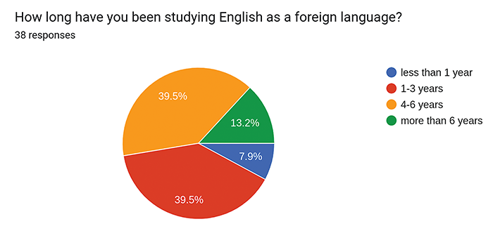 Almost 53% of the students (20 out of 38) confirmed having studied English as a Foreign Language for at least 4 years up the the date of the study, and 92% (35 out of 38) self-labeled their level of English as intermediate to advanced.